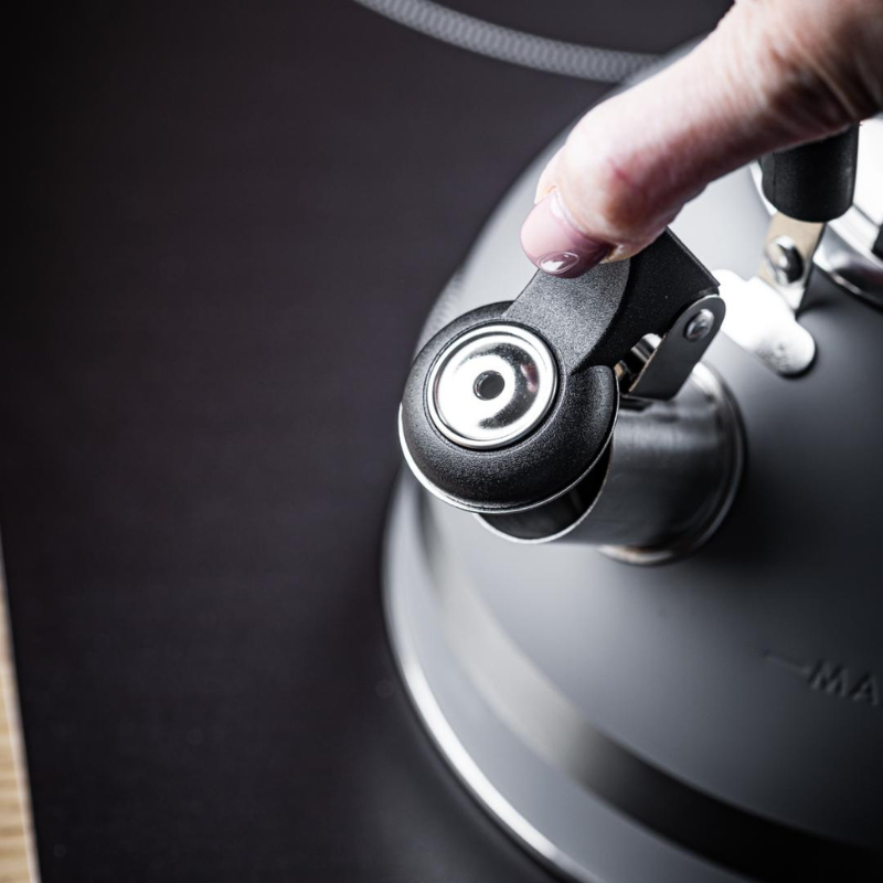 Czajnik posiada wygodną, nienagrzewającą się rączkę z powłoką soft touch, która gwarantuje komfort użytkowania. Wbudowany głośny gwizdek informuje o zagotowaniu wody, a ergonomiczny mechanizm otwierania dziobka umożliwia bezpieczne nalewanie.