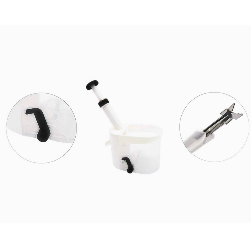 - Materiał wykonania: Drylownica w całości wykonana jest z wysokiej jakości tworzywa sztucznego, co zapewnia jej trwałość i łatwość w utrzymaniu czystości. Trzpień drylujący oraz mechanizm sprężynowy wykonane są ze stali, co gwarantuje niezawodność działania.