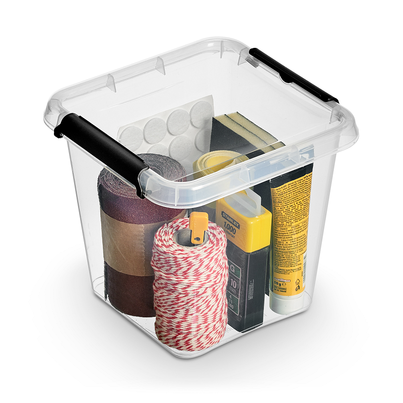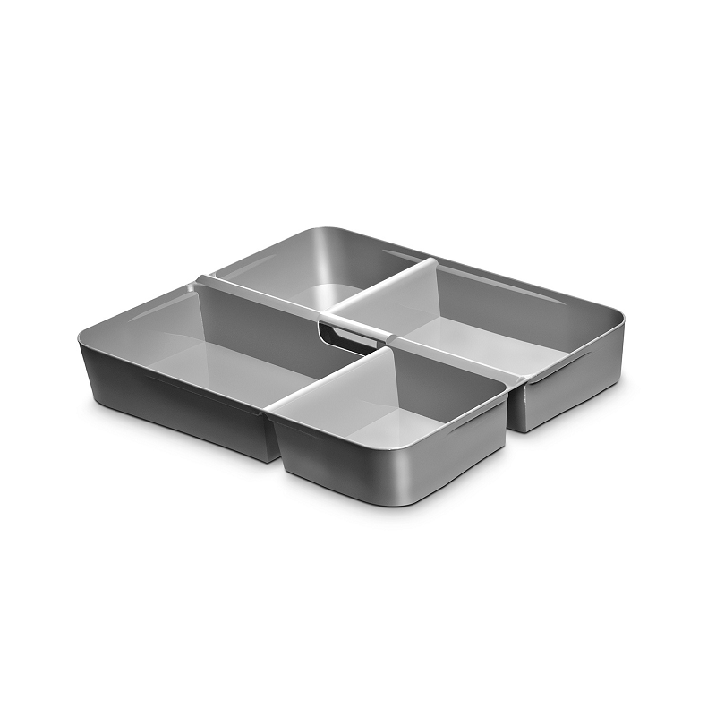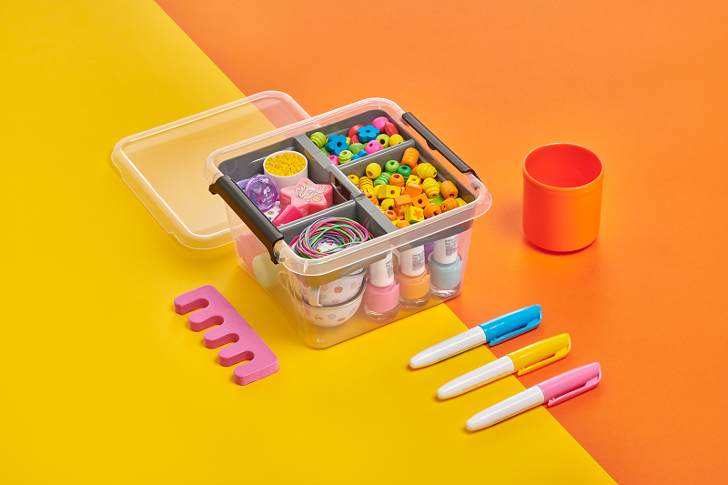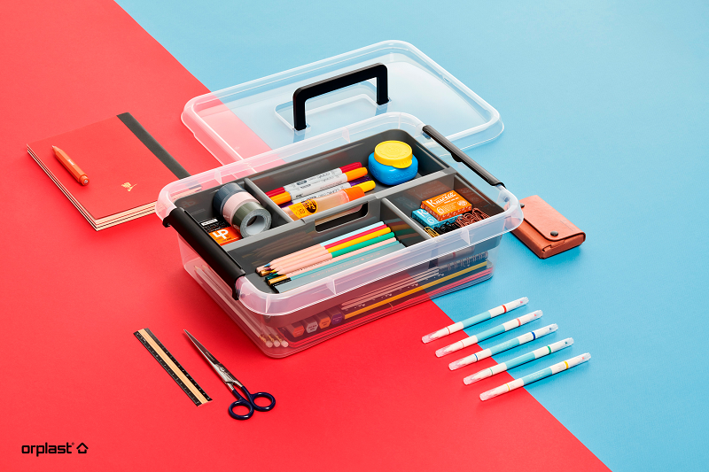 Zapięcie pozwala na swobodne przenoszenie pojemnika. Wyjmowana wkładka koloru stalowego, może być wykorzystana jako oddzielny pojemnik do segregacji drobnych przedmiotów np. kredek, ołówków, gumek, nici, igieł, lekarstw itp.