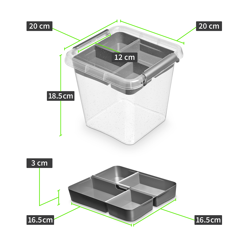Oferujemy wysokiej jakości pojemnik wykonany z transparentnego tworzywa sztucznego wyposażony we wkładkę, także wykonaną z tworzywa sztucznego, która w sposób znaczący poszerzy możliwości wykorzystania pojemnika.