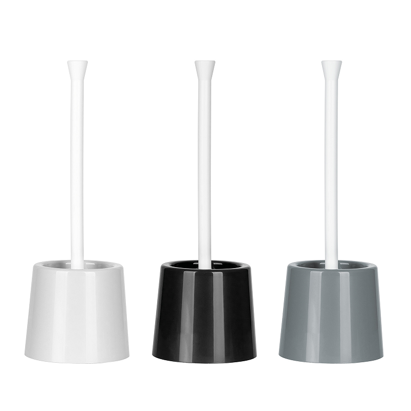 Plastikowa, stojąca szczotka do WC z okrągłą podstawą i berłem z tworzywa sztucznego jest łatwa w utrzymaniu czystości i odporna na uszkodzenia mechaniczne oraz korozję.