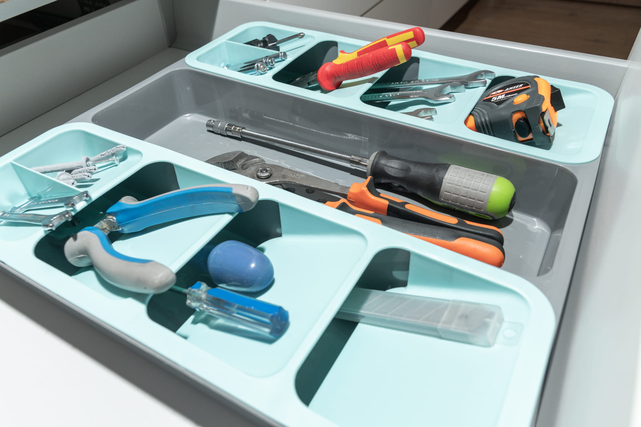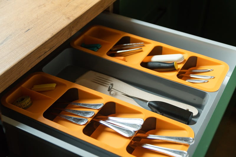 Polecamy innowacyjny wkład do szuflad, który pomieści trzy razy więcej sztućców, narzędzi kuchennych w porównaniu z tradycyjnym wkładem, o podobnych wymiarach.